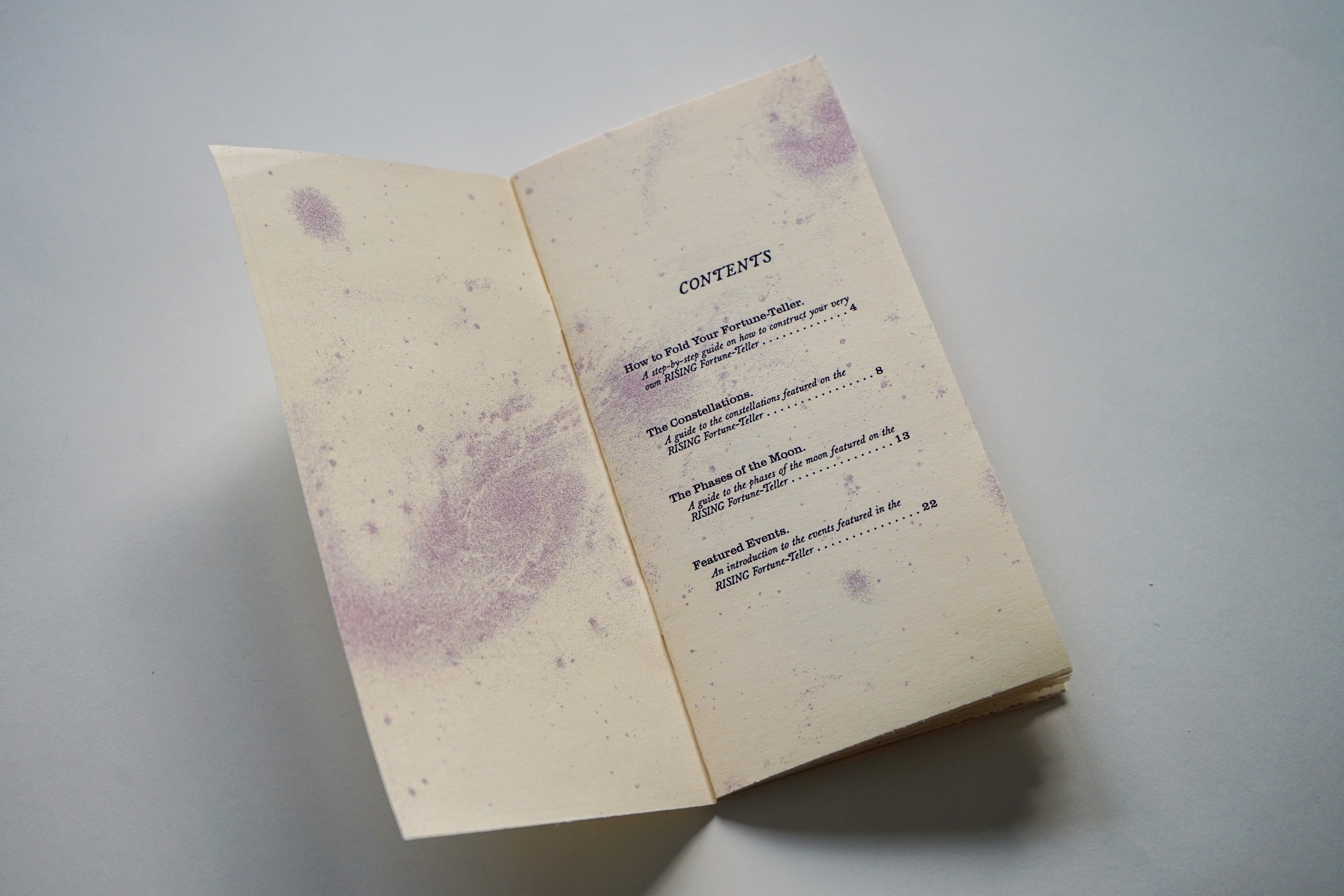 The RISING Fortune-Teller is an engaging and interactive experience designed to guide potential festival-goers through the diverse range of events available at RISING. This carefully crafted approach aims to inform attendees without causing any feelings of overwhelm. The celestial-themed fortune-teller adds a delightful element of whimsy and nostalgia, transforming the discovery process into a tactile and playful adventure. By incorporating a detailed guide and an interactive 3D model, we ensure that the experience is accessible to all, whether they engage physically at the festival or digitally through the website.